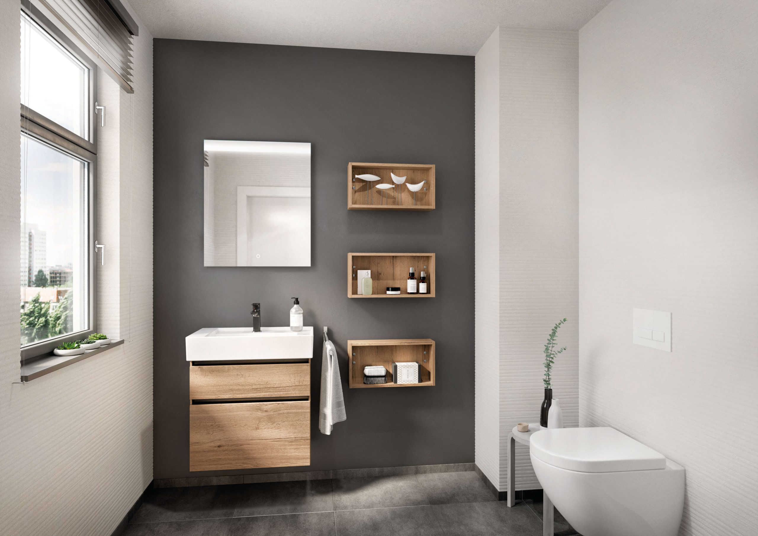 Eine perfekte und praktische Lösung für das Gäste-WC: Schrankelemente mit geringer Tiefe, die extra für kleine Räume entwickelt wurden. Zusätzlichen Komfort bietet z.B. eine pflegeleichte ultramatte Oberfläche mit Anti-Fingerprint für einen cleanen Look ohne Finger- abdrücke.